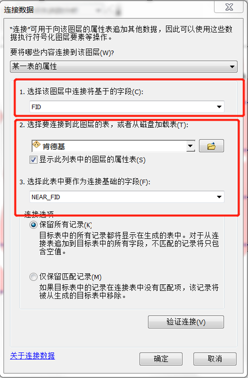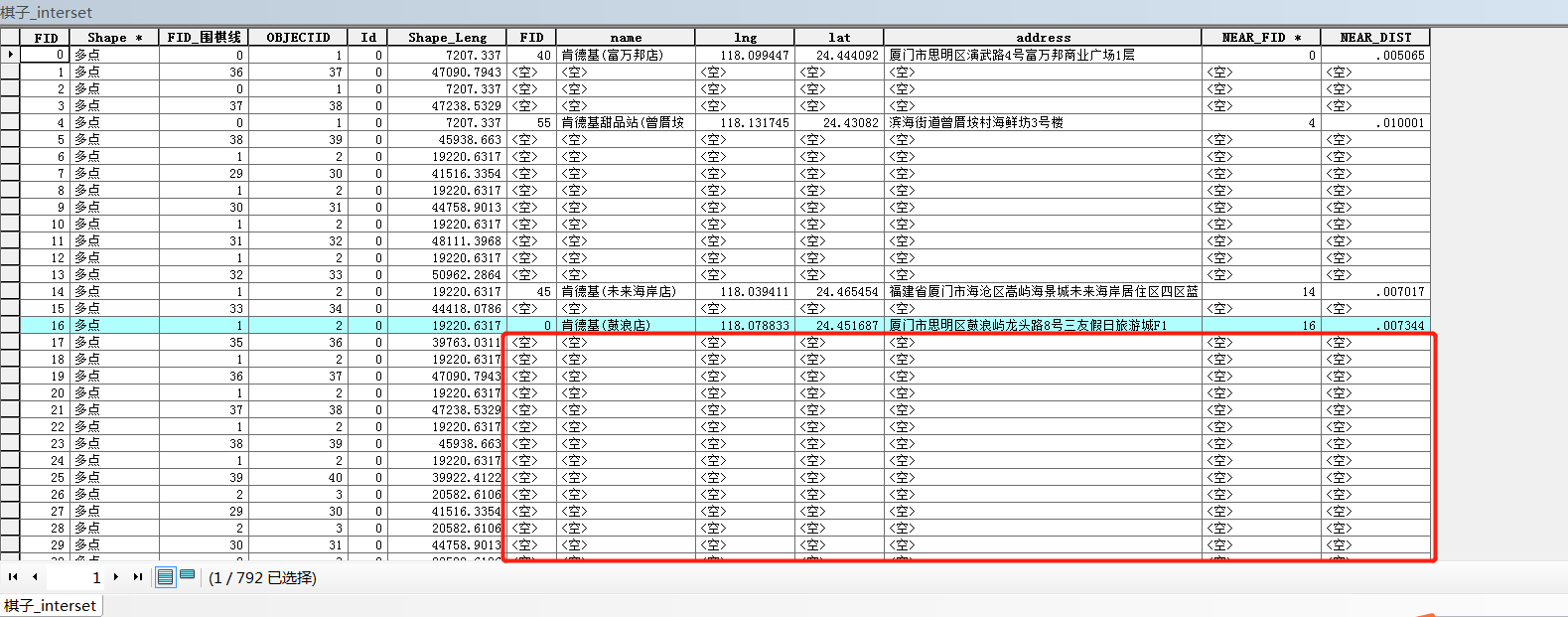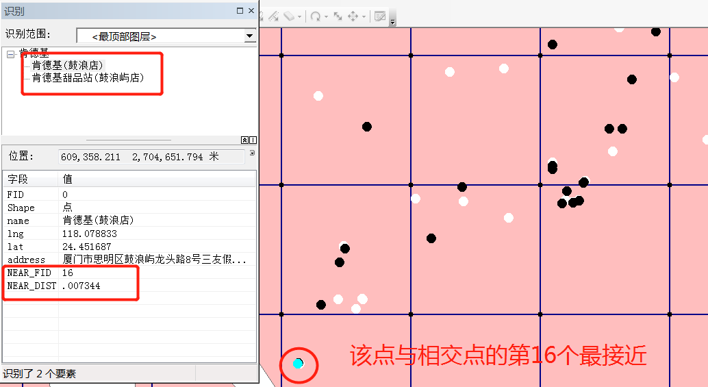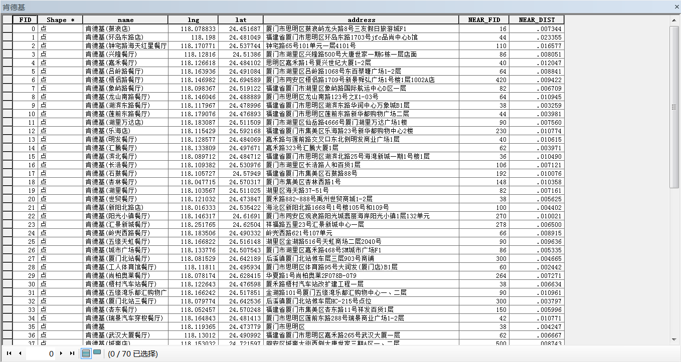 打开肯德基的属性表,可以看到新增了NEAR_FID和NEAR_DIST两个字段