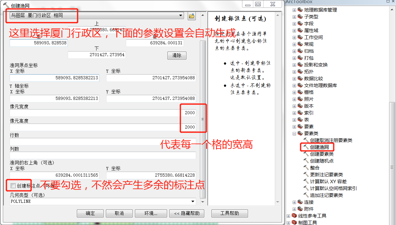 利用【数据管理工具】|【要素类】|【创建渔网】生成棋盘