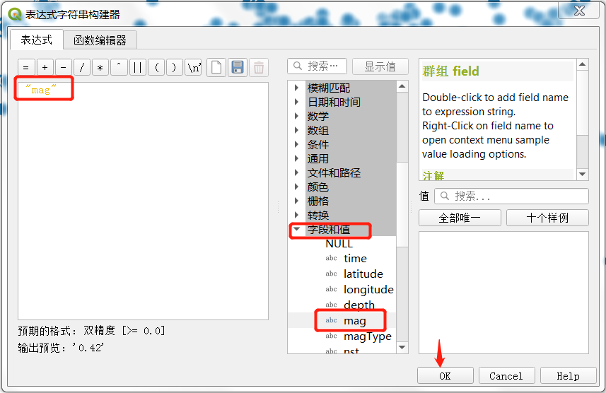 【大小】|【编辑】打开【表达式字符串构建器】|【字段和值】| mag(震级)|