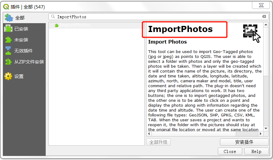 下载【插件】|【管理并安装插件】| 搜索插件【ImportPhotos】