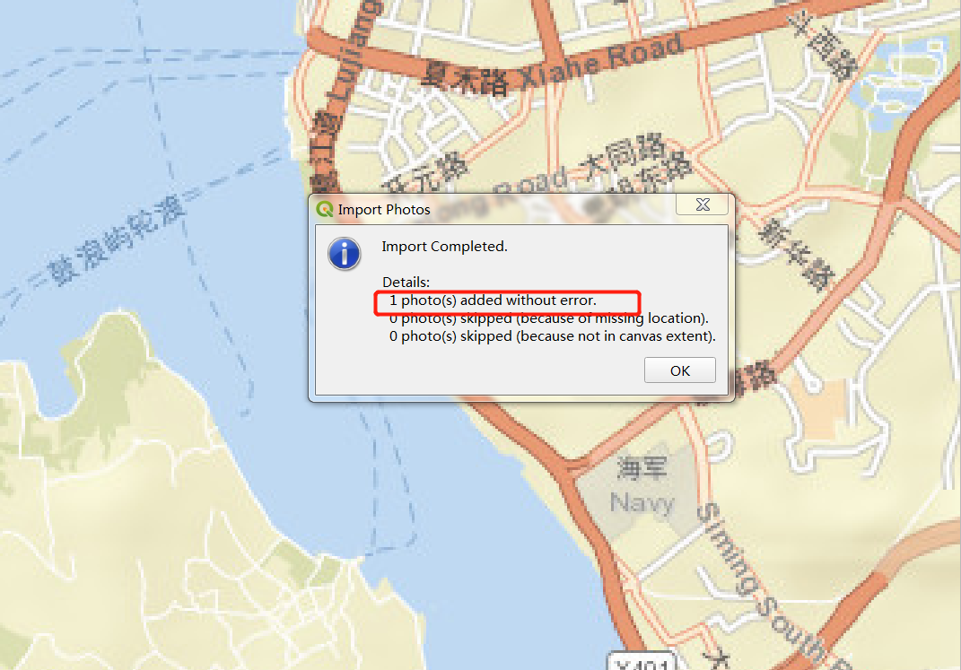 弹出照片导入对话框,在对话框中选择照片存储的位置,以及有信息数据的图片,点击OK即可(注意:数据路径最好不要有中文)等一会后,会提示你几张照片添加成功,有些照片因为缺少坐标信息会导入失败