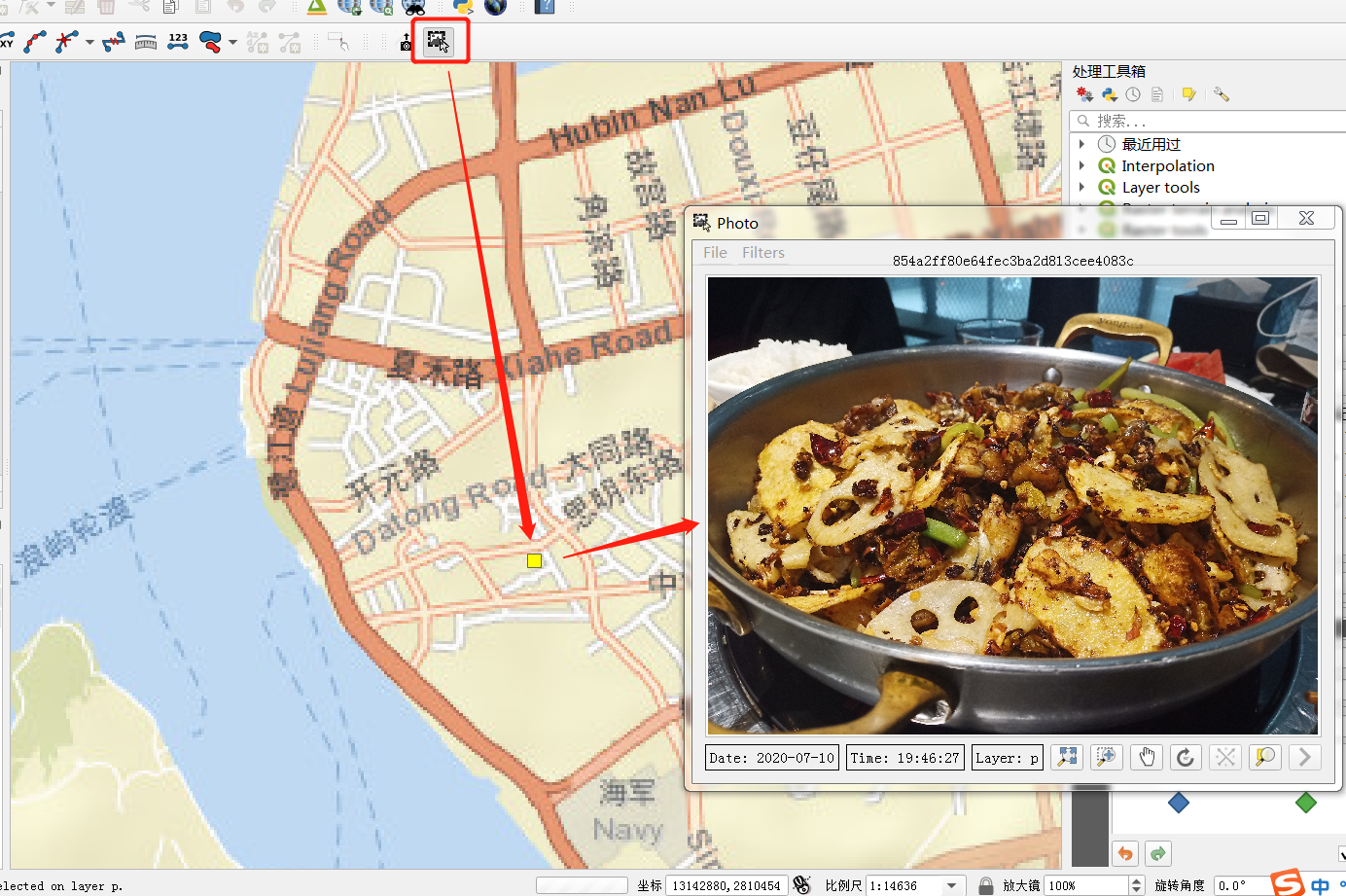 在工具栏上新加载的插件点击如图所示的图标,然后点击地图上的图片,然后就可以看到照片放大的效果