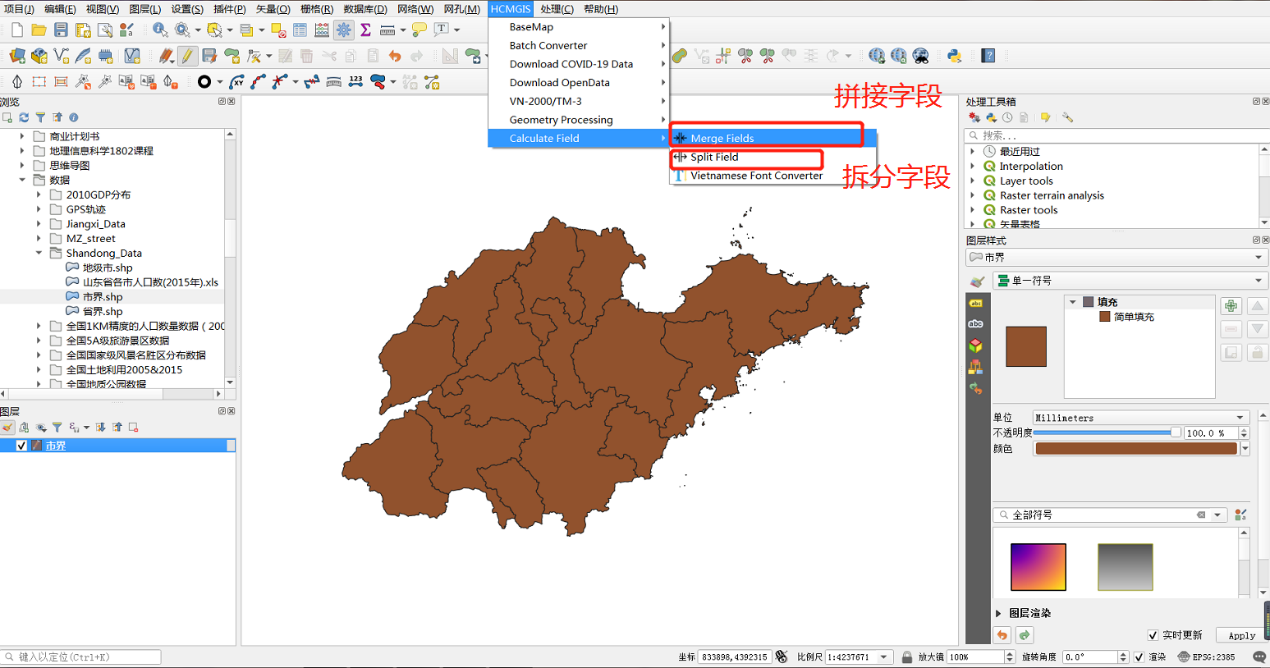 • 属性字段的拼接和拆分(利用HCMGIS插件)