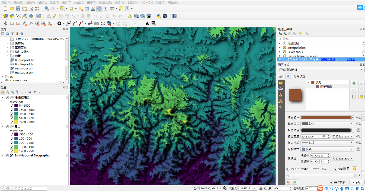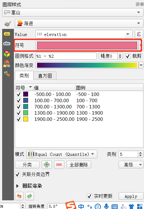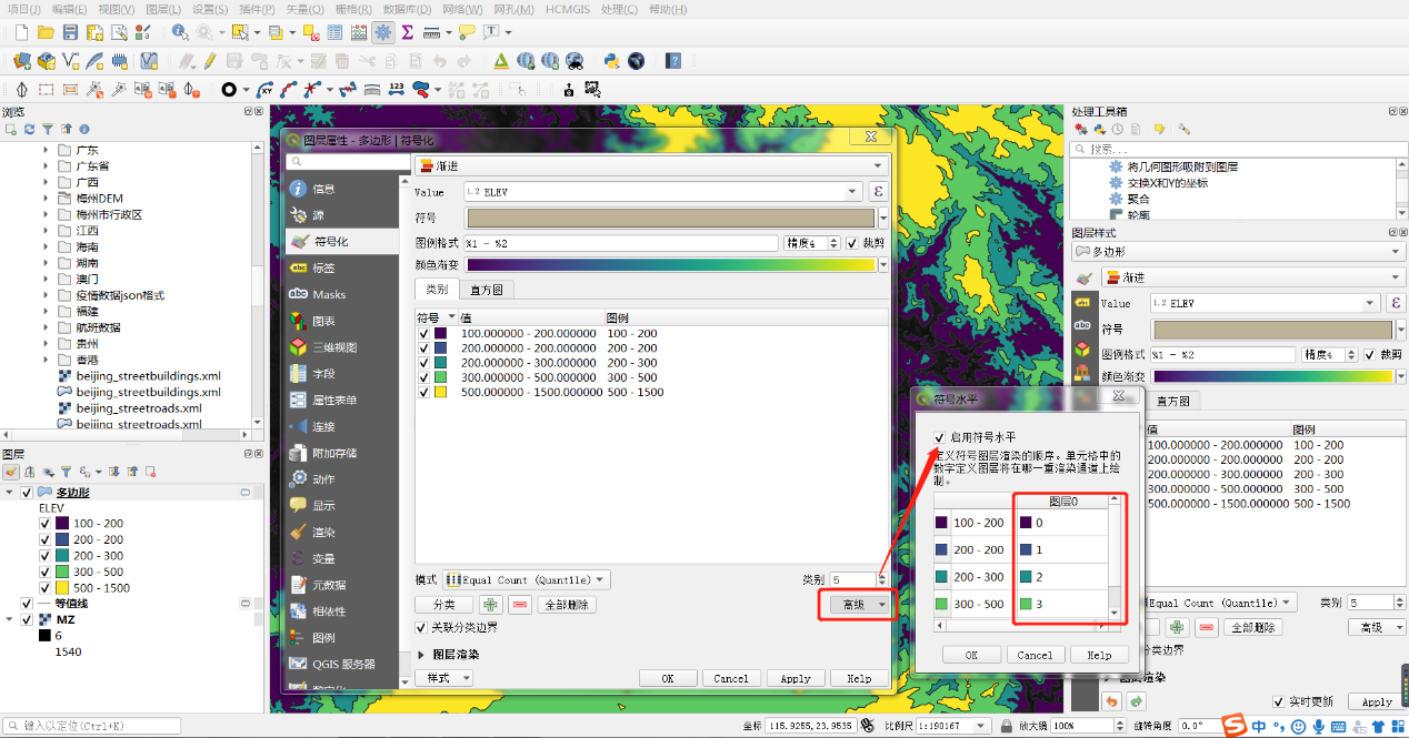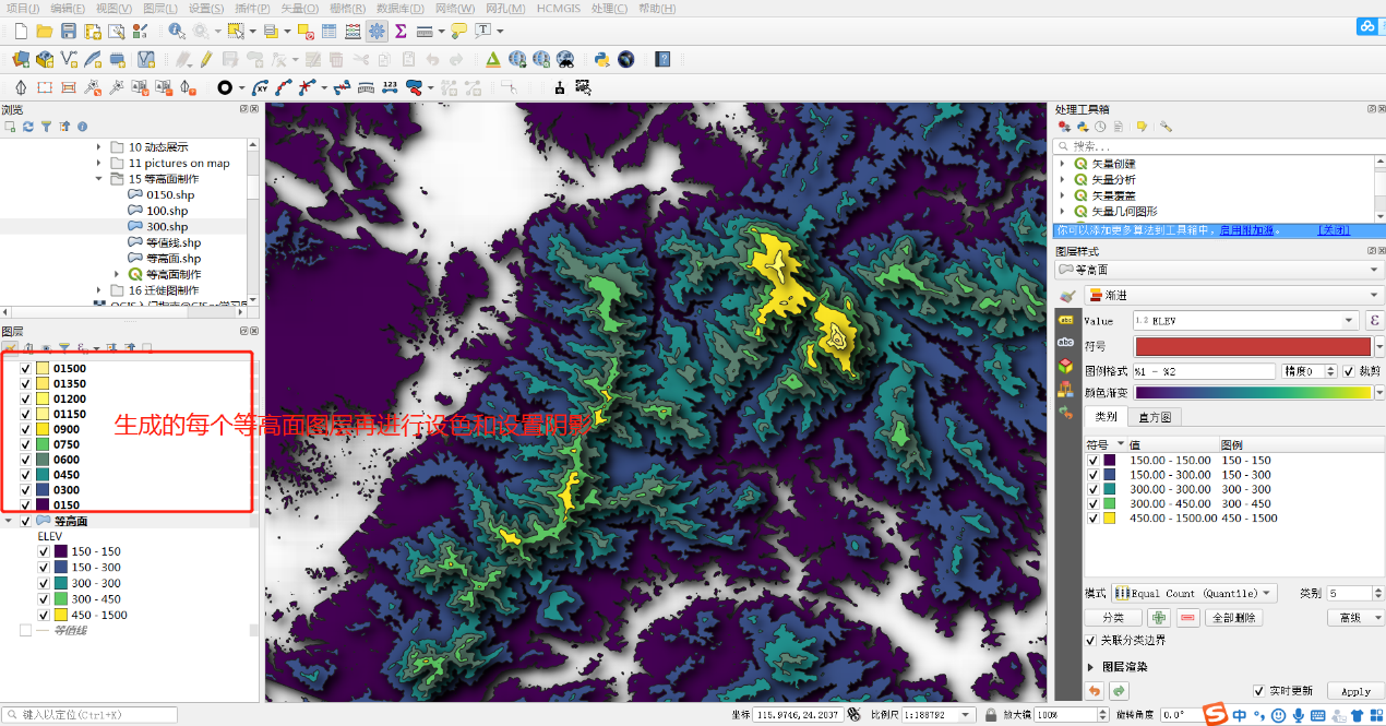 将等高面符号化,在图层样式上将图层设置为【渐进】,VALUE取ELEV,然后点击【分类】,选择合适的渐变色进行表达