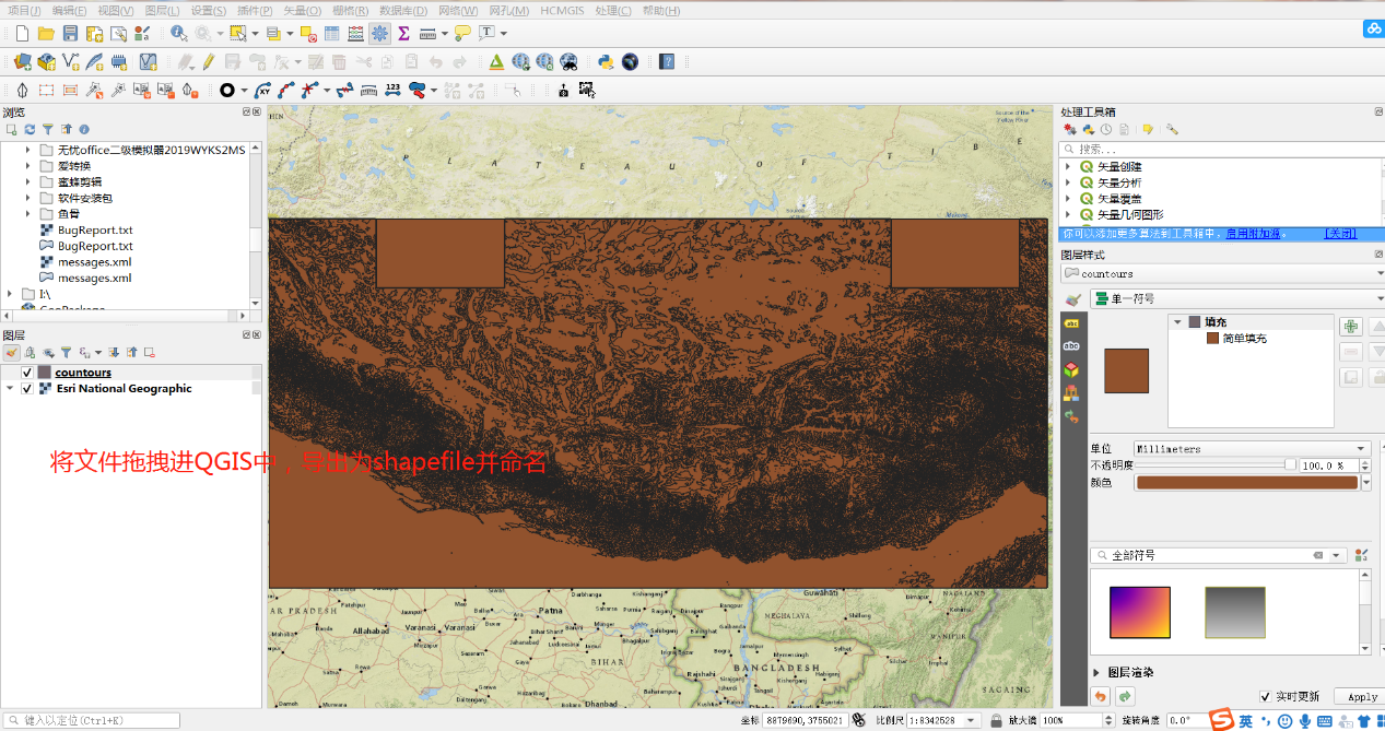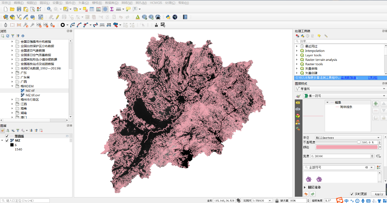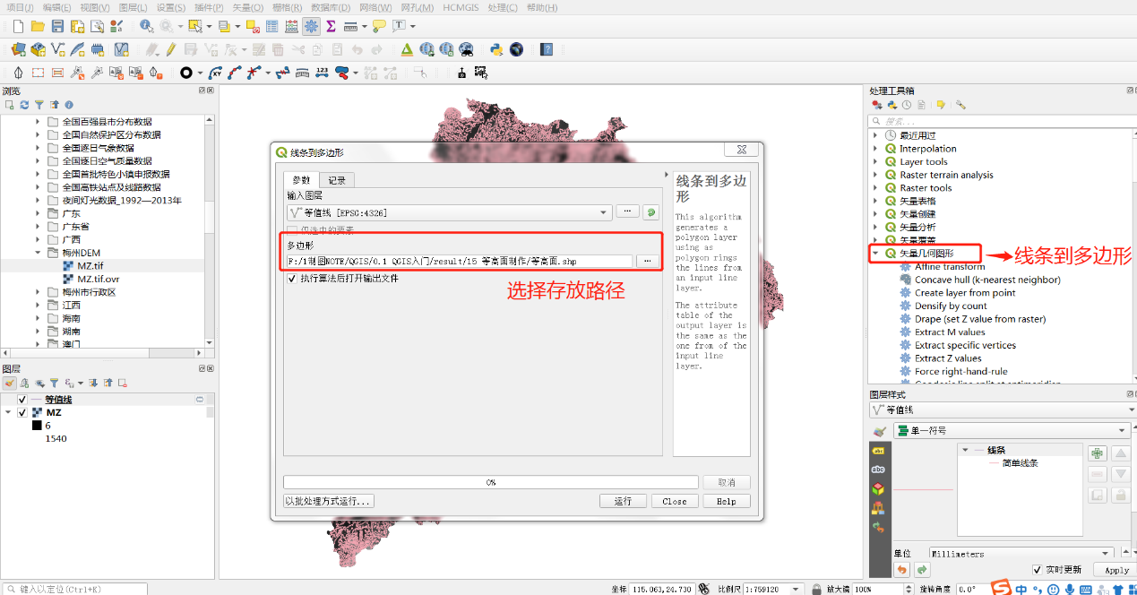 利用菜单栏上【矢量】|【几何图形工具】|【线条到多边形】或者处理工具箱中【矢量几何图形】|【线条到多边形】将等高线转换为等高面