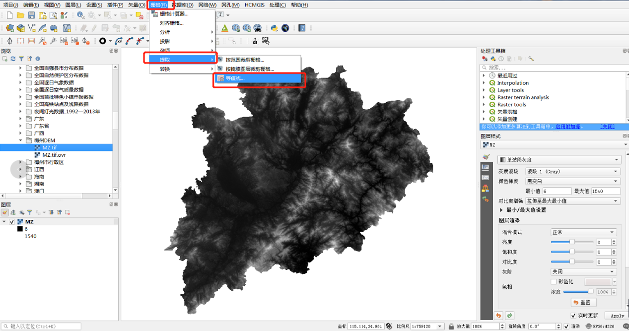 利用DEM数据提取等高线,打开菜单栏上【栅格】|【提取】|【等值线】提取等高线