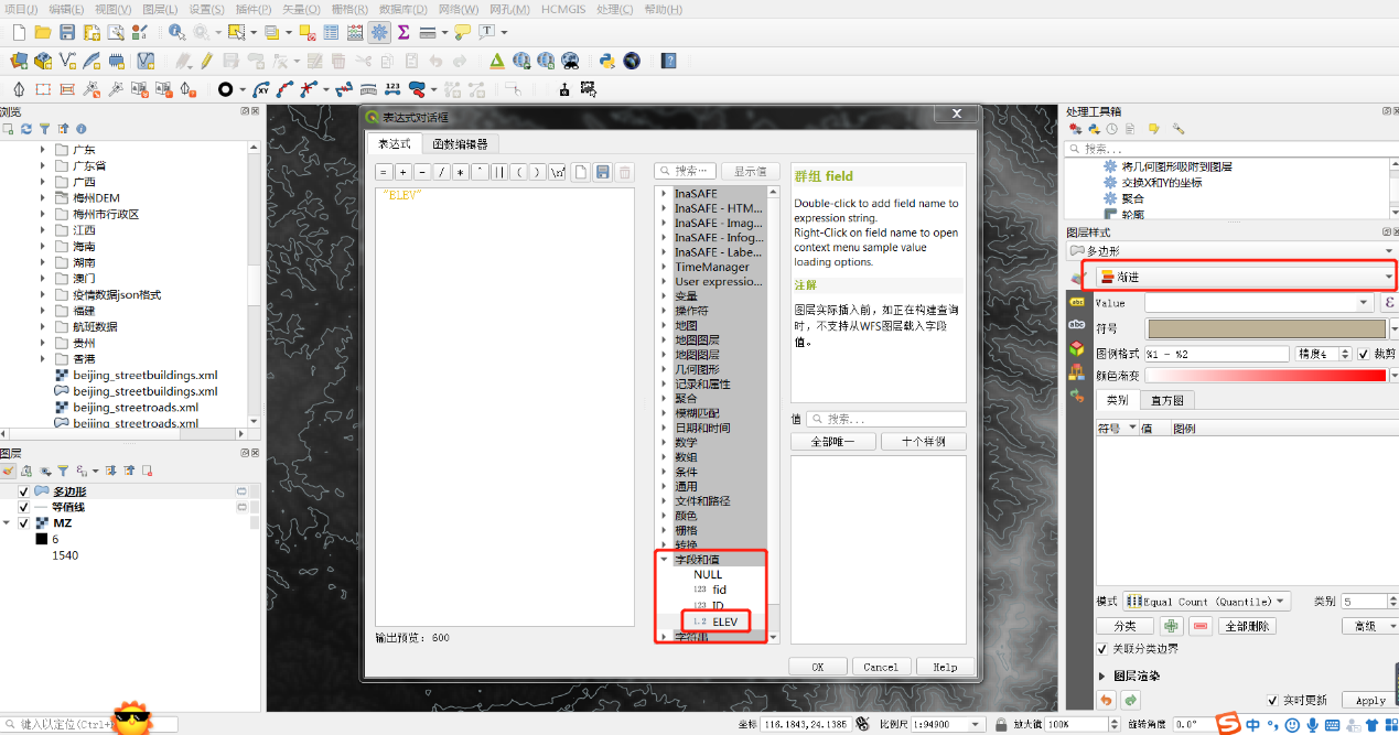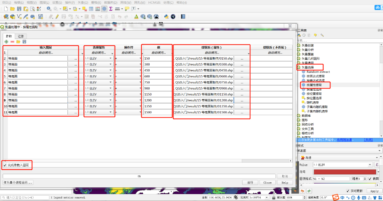 拆分等高面,将等高面按照高程属性划分为对个图层数据,因为需要设置多个表达式进行筛选,我们利用批处理的方式进行,在处理工具箱