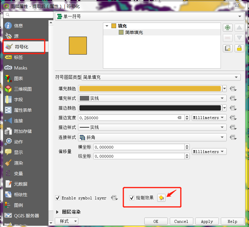 生成多个数据图层,分别在每个图层属性选中简单填充,勾选【绘制效果】,然后点击