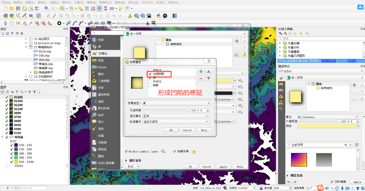 若想要显示等高面凹陷的效果,可以将上述绘制效果改为【内阴影】