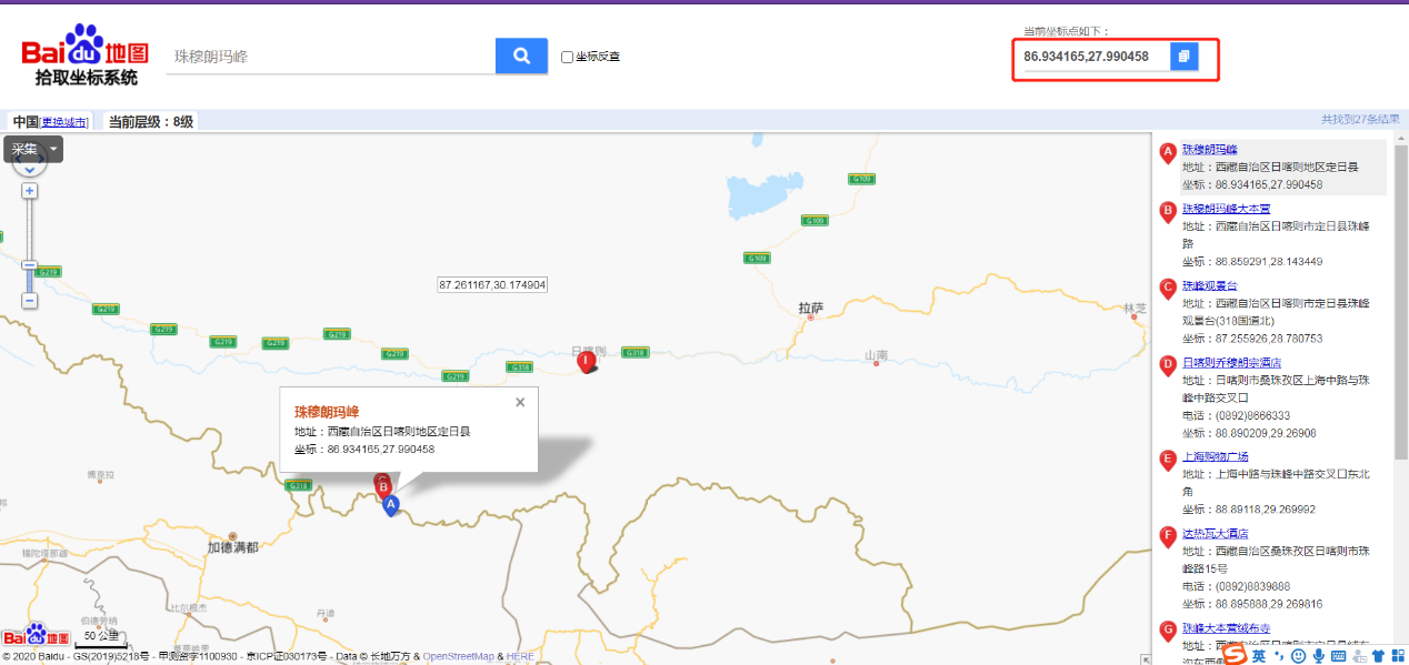 打开百度坐标拾取系统,拾取你要研究区域的坐标点(这里以珠穆朗玛峰为例)